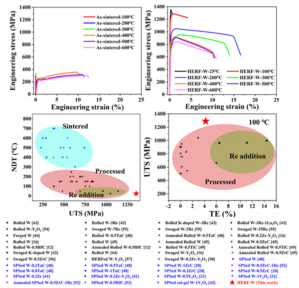 图2. 烧结态纯钨和高能率锻造纯钨在不同温度下的工程应力-应变曲线以及不同类型钨材料的力学性能比较。