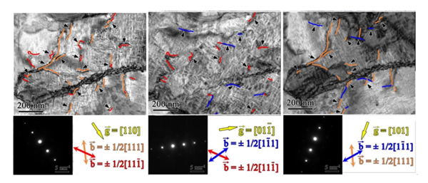 图3. 不同g矢量条件下位错特征(刃位错:位错线垂直于Burgers矢量;螺位错:位错线平行于Burgers矢量;复合位错:位错线与Burgers矢量间夹角在 0° 到 90° 之间)。