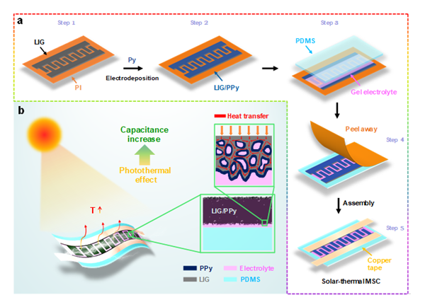 图1.(a)光热增强型超级电容器的制备过程;(b)太阳能光热自加热示意图。