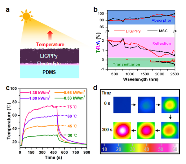 图3. (a) 光热型超级电容器电极结构截面示意图;(b) 电极材料和器件的紫外-可见-近红外透过率(T)、反射率(R)和吸收光谱(A);(c) 不同光照强度下器件的升温时间曲线;(d) 一个太阳光照下器件在升温过程中的热红外图像。