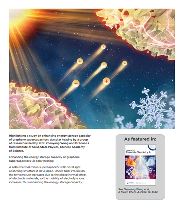 近期,中科院合肥研究院固体所王振洋研究员团队在光热增强型超级电容器研究方面取得进展。相关研究成果以“Enhancing Energy Storage Capacity of Graphene Supercapacitors via Solar Heating”为题,作为封面发表在Journal of Materials Chemistry A (J. Mater. Chem. A, 10, 3382-3392(2022))期刊上。