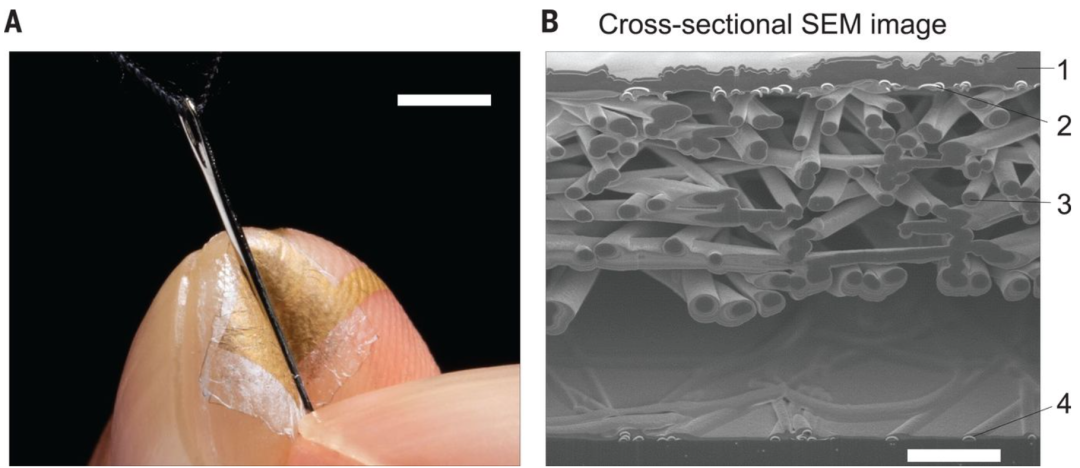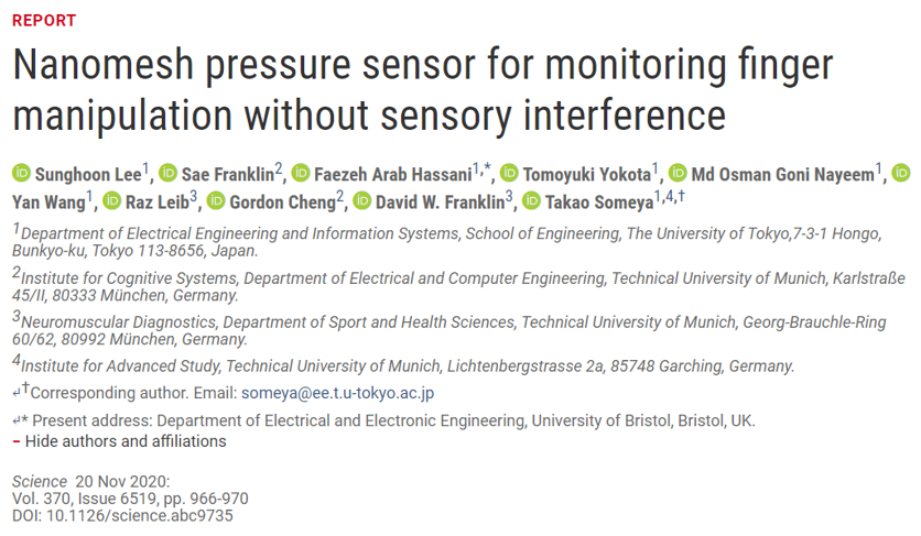 Takao Someya团队通过纳米静电纺丝技术,制作出了一种超薄轻柔的力学传感器。通过一系列研究,验证了其对手指触觉的影响微乎其微,这一性能使得该传感器在人体动作研究中有十分广阔的应用前景,对人体仿生学领域具有十分重大的意义。