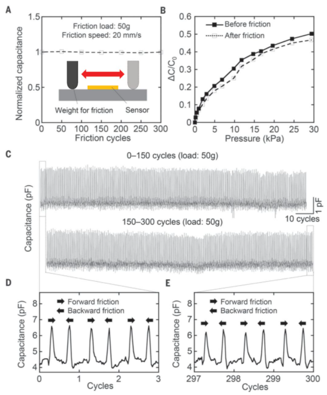 为了保证传感器不会影响手指上的触觉,因此传感器轻薄柔软的特性是成败的关键。Takao Someya团队采用了纳米级别的静电纺丝技术,采用了聚氨酯等柔性材料,保证了制作出的传感器的轻薄特性和柔软程度。聚对二甲苯涂层可以提高柔性力学传感器的灵敏度(压力低于1kPa时灵敏度为0.141kPa-1,高于10kPa时灵敏度为0.01kPa-1),而金纳米网络则保证了电信号的传输。该力学传感器为典型的电容器结构,整体结构分为四层,分别为嵌入纳米网络的聚氨酯钝化层、顶部金纳米网络电极层、涂有聚对二甲苯涂层的聚氨酯纳米网络中间层,底部金纳米网络电极层。该传感器主要通过形状的改变使得传感器整体电容的变化,以此反应力的大小。