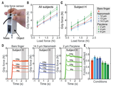 本文定量研究了传感器对人的触觉的影响,通对比在手指上贴上传感器与裸露的手指的抓握力,贴上传感器与裸露手指相差无几。而在贴了2微米厚的力学传感器后,手指的抓握力还增加了14%。