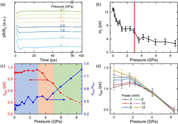 图1. 不同压力下的Sb2Te3的飞秒泵浦-探测反射光谱以及相干声子寿命、快时间、热声子瓶颈效应随压力的变化趋势。