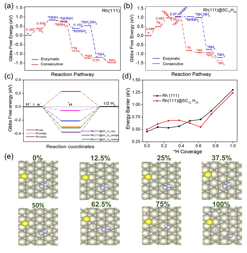 图2. (a)Rh(111);(b)Rh(111)@SC12H25上NRR过程吉布斯自由能图;(c)HER过程吉布斯自由能图;(d)不同氢覆盖度下N2加氢能垒;(e)氢覆盖度示意图。