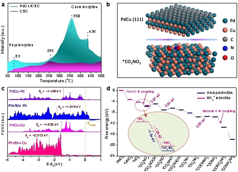 图2. (a) PdCu/CBC 和CBC样品的CO2-TPD图;(b) DFT计算优化的Pd−Cu合金 (111)晶面和中间体*CO2NO2结构图;(c) 双金属Pd−Cu、单金属Pd和单金属Cu的Pd-4d或Cu-3d轨道的态密度图,虚线表示Pd或Cu原子的d带开云(中国),费米能级设置为0 eV;(d) DFT计算PdCu/CBC电催化合成尿素途径的吉布斯自由能图。