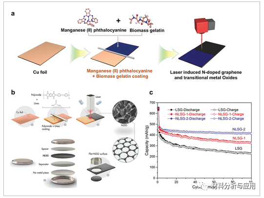 图6. 使用木质素作为低成本前体的激光光刻工艺流程及性能图示