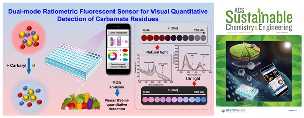 近期,中科院合肥物质院固体所能源材料与器件制造研究部蒋长龙研究员团队在基于荧光共振能量转移效应的双模态纳米传感器用于可视化检测环境中的西维因研究方面取得新进展。相关研究成果以“Ultrasensitive and On-site Detection of Carbaryl Pesticides via Dual-mode Nanosensor Utilizing Portable Device”为题,作为主封面发表在国际著名期刊ACS Sustainable Chemistry & Engineering (ACS Sustainable Chem. Eng., 2023, DOI: 10.1021/acssuschemeng.2c06499)上。 西维因作为一种有效的广谱氨基甲酸酯杀虫剂,已广泛用于防治农作物害虫。然而,过量使用或错误的使用方式会导致西维因残留。西维因在土壤、水果、粮食等介质中留存时间长,且易通过呼吸道和皮肤接触进入人体内,会对人体造成严重危害。因此,西维因残留的检测研究引起了极大的关注。近年来,农药残留的定性定量检测仍然侧重于仪器检测,如表面增强拉曼光谱、电化学分析、色谱等,但这些技术由于检测耗时长和复杂的样品预处理,不能满足现场快速检测需求,限制了它们的实际应用。因此,开发便携式和可靠的实时分析方法来检测西维因残留,对环境污染物监测和农业食品安全具有重要意义。