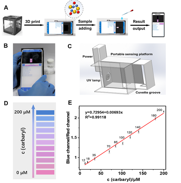 图2. (A)智能传感平台的检测示意图;(B)智能手机对荧光图像的RGB分析;(C)具有高兼容性的便携式传感平台;(D)紫外光下,荧光传感体系在加入浓度为0至200 μM的西维因后的图像;(E)荧光颜色变化(B值/R值)与西维因浓度的线性关系图。