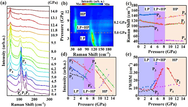 图2. (a)室温下CrSiTe3的高压拉曼光谱图; (b)压力下的拉曼光谱强度变化三维图,其中LP代表低压相,HP代表高压相;(c) 压力下的拉曼峰位置变化图; (d) 压力下的拉曼峰强度变化图;(e) 压力下的拉曼峰半峰宽(FWHM)变化图。