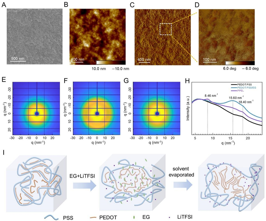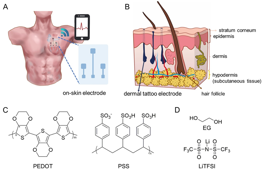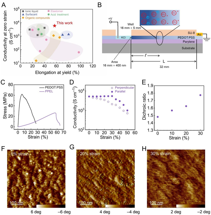 与依赖于电子和空穴传输的传统无机材料相比,聚合物链级离子和电子导电性的共存使之成为生物电子应用中最具吸引力的候选材料。其中,聚3,4-乙烯二氧噻吩:聚苯乙烯磺酸(PEDOT:PSS)因其导电率可调、良好的机械柔性和生物相容性等优点,已被广泛应用于柔性可穿戴电子设备。然而,未经处理的PEDOT:PSS导电性和可拉伸性较低,很大程度上限制了其应用。