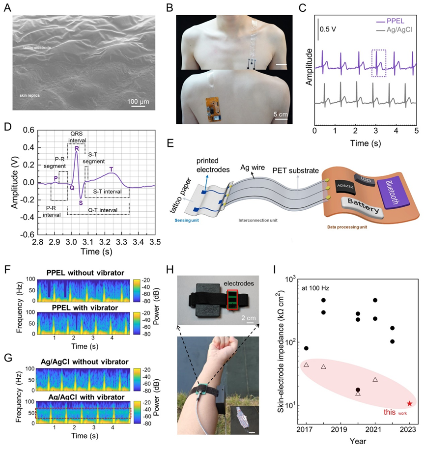 近日,清华大学深圳国际研究生院徐晓敏、成会明、马少华团队开发了一种基于PEDOT:PSS改性的导电聚合物体系,PEDOT:PSS/EG/LiTFSI(以下简称PPEL),制得的超柔性PPEL纹身电极兼具良好的生物相容性、高导电性(5165 S cm-1)和高拉伸性(断裂伸长率>56.9%),能够实现与人体皮肤的共形贴附。该柔性纹身电极相较于商业化的Ag/AgCl凝胶电极(31.7 kΩ cm2)在100 Hz频率下表现出更低的皮肤阻抗(10.6 kΩ cm2)和优异的稳定性,在静、动态监测过程中产生的信号噪音极低,实现在皮肤及身体运动等复杂状况下高分辨实时心电(ECG)和肌电(EMG)信号监测。