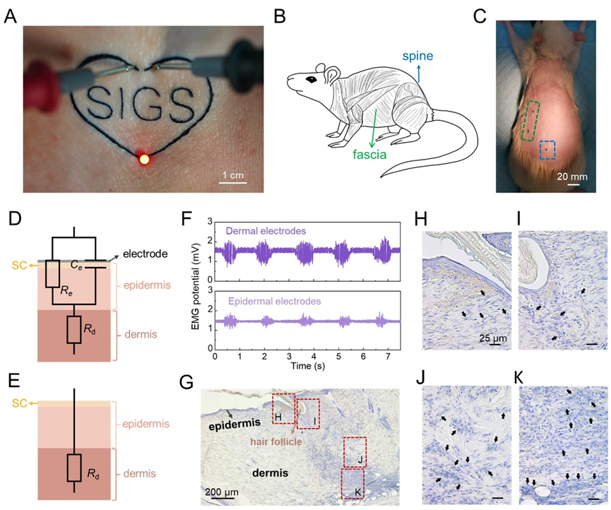 皮肤集成电子因其在个性化健康管理、通讯和人机交互等多领域的应用潜力而受到广泛关注。其中,“纹身电子”(表皮电子)泛指一种可直接贴在皮肤上的柔性贴片,具有临时纹身的轻松、舒适等特点。纹身,将墨水或染料颜料注入皮肤真皮层,是一种已普遍存在的身体修饰技术。迄今已报道的“纹身电子”大多以皮肤表面集成的形式呈现,而使用真皮纹身实现电生理信号的精确诊断是一种尚未探索的皮肤集成电子范式。
