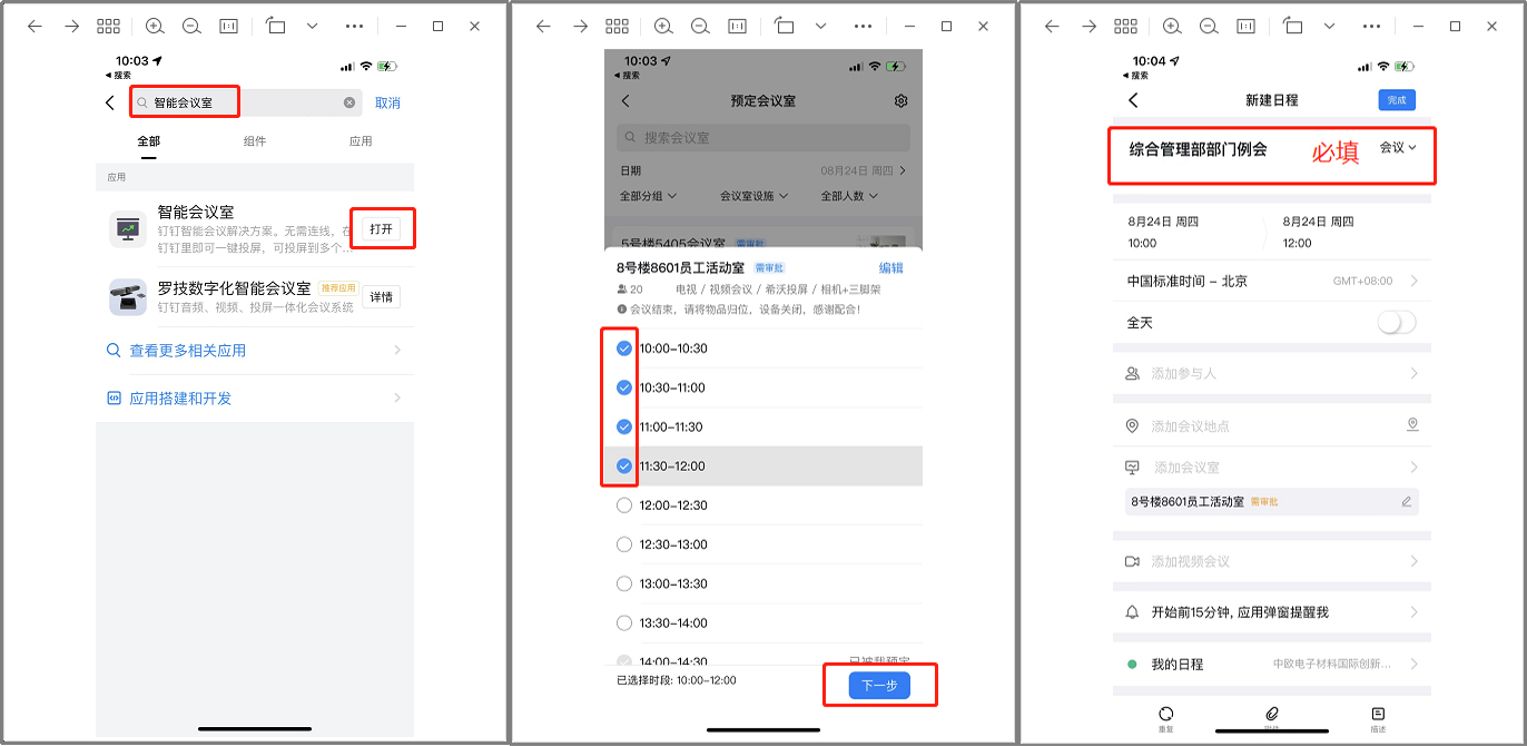 步骤二:选择会议室—点击时间段(可多选)—点击“下一步”。