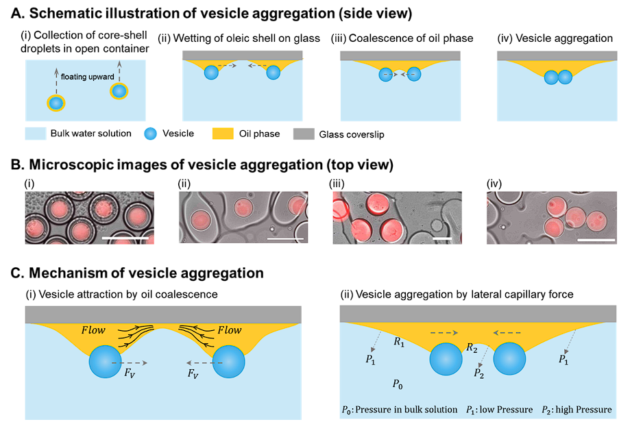 图二:毛细流驱动的脂质囊泡聚集机制。(A)示意图和(B)光学显微镜图像,显示脂质囊泡毛细流驱动的组装过程:(i)在开放容器中收集的核壳液滴;(ii)核壳液滴的溶剂壳润湿亲油盖玻片,油滴因此变形;(iii)相邻的核壳液滴相互接触并聚结;(iv)由于侧向毛细流吸引而导致的脂滴聚集。(C)两个油筏聚集示意图(i)在湿润的盖玻片上,相邻的两个油筏相互接触,它们之间形成油桥;(ii)通过毛细压力将两个油筏合并为一个,促进两个囊泡的聚集。