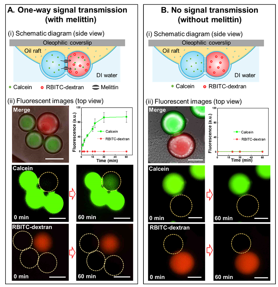 图四:两个组装的GUVs之间界面上典型双层结构的形成。(A) 示意图(i)与荧光显微图像(ii)以及荧光强度随时间变化的图表,揭示了通过带有膜蛋白(蜜蜂毒肽)重构的组装GUVs进行受控信号传输现象。蜜蜂毒肽在两个紧密包裹的囊泡之间形成的脂质双层结构中创造了通道。较小的绿色荧光的钙黄绿色分子能够穿过,而较大的红色荧光的RBITC-葡聚糖分子则不能穿过。(B) 示意图(i)与荧光显微图像(ii)以及荧光强度随时间变化的图表,展示了没有通道蛋白的GUVs进行信号传输时的现象作为对照组,这里的钙黄绿素和RBITC-葡聚糖均不能穿过GUVs之间形成的脂质双层膜。
