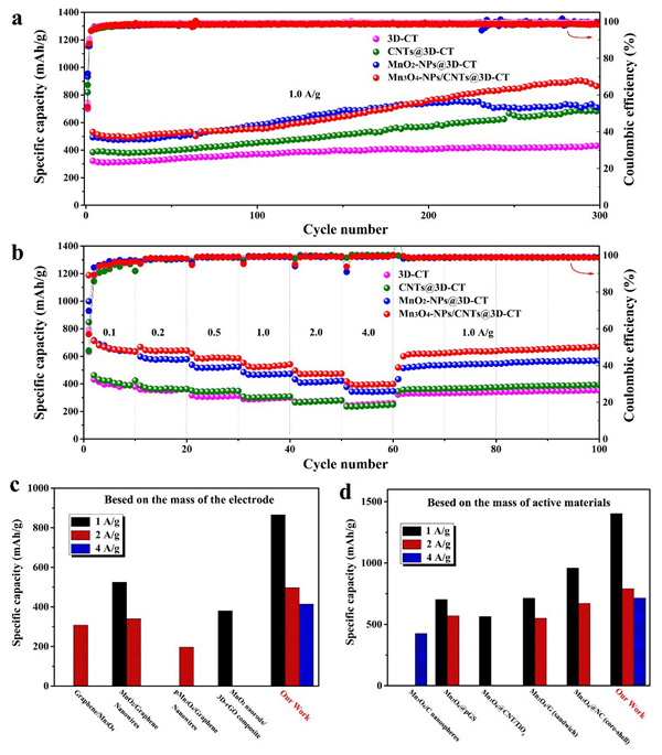 图3. 电化学性能:(a)3D-CT、CNTs@3D-CT、MnO2-NPs@3D-CT和Mn3O4-NPs/CNTs@3D-CT四种电极在相同电流下的循环性能对比;(b)四种电极在不同电流下的倍率性能对比;(c,d)Mn3O4-NPs/CNTs@3D-CT电极与迄今报道的Mn3O4基其它复合电极在1.0、2.0和4.0 A/g时的性能对比。