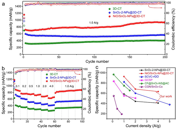 图5. 3D-CT、SnO2-NPs@3D-CT和NiO/SnO2-NPs@3D-CT电极的电化学性能对比:(a)循环性能对比;(b)倍率性能对比;(c)NiO/SnO2-NPs@3D-CT网格膜电极和SnO2-NPs@3D-CT电极以及此前报道的SnO2复合电极在1、2和4 A/g下的性能对比。