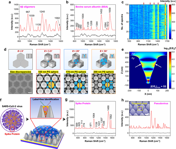图4. 阿兹海默疾病标志物、牛血清白蛋白、SARS-CoV-2假病毒等大尺寸分析物的SERS检测结果。