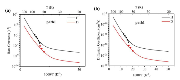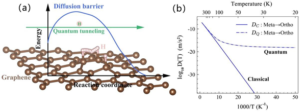 图3. 石墨烯表面上氢的量子隧穿现象(a),扩散系数的经典和量子过程对比(b)。