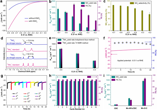 图2. (a)Mn-O-C样品分别在含有和不含有KNO3的Ar饱和的0.1 M K2SO4电解质中对应的线性扫描伏安曲线; (b)不同电位下对应的产氨速率和法拉第效率;(c)不同电位下的产氨选择性; (d) 最佳电位下分别以15NO3和14NO3和标样的1H NMR谱图; (e) 最佳电位下靛酚蓝和1H NMR两种方法定量检测氨速率对比图;(f)长时间NO3−RR测试;(g) 和 (h) 循环稳定性测试;(i) CBC,Mn-NPs/CBC 和Mn-O-C样品NO3−RR性能对比图。