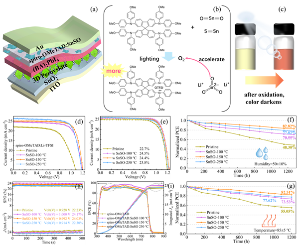 图.(a)该研究中采用的太阳能电池结构;(b)空穴传输材料中反应的示意图;(c)spiro-OMeTAD溶液氧化过程中颜色变化的简单示意图;(d)基于传统spiro-OMeTAD和预氧化spiro-OMeTAD:SnSO(在不同温度下处理的SnSO纳米材料)的PSCs的初始电流密度-电压(J-V)曲线;(e)基于不同HTM的冠军PSC的J-V曲线;在(f)50±10%的高湿度和(g)85±5°C的热老化条件下,基于传统和SnSO纳米材料掺杂spiro-OMeTAD的未封装PSCs的PCE跟踪;(h)最大功率点的稳态测试;(i)具有不同HTM的冠军器件的IPCE光谱。