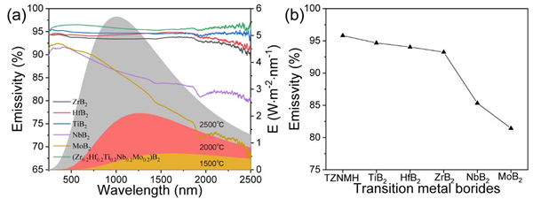 图2. TZNMH高熵硼化物及五种单组元二硼化物在0.3-2.5 μm波段的辐射特性:(a) 半球发射率光谱和理论黑体的辐射率;(b) 平均光谱发射率。