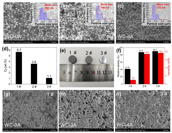 图2. 不同游离碳含量的WC粉末样品SEM图像:(a)WC-0A,(b)WC-3A,(c)WC-4A;三种WC粉体的放电等离子烧结试样的(d)游离碳含量,(e)光学图像,(f)相对密度和硬度;(g-h)不同烧结样品的SEM图像。