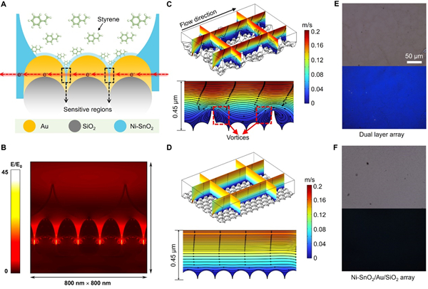 鉴于此,固体所研究人员从半导体电学传感器具有实时监测、而贵金属表面增强拉曼光谱(SERS)可以指纹识别的特点出发,提出将两种技术高效融合、由“电学响应”触发“谱学识别”的双模敏感新思路,以期基于一个器件同时实现目标气体的实时监测和精准识别。研究人员设计了新型的叠层复合阵列敏感结构,通过敏感单元界面自组装策略,先后将贵金属结构阵列和氧化物多孔薄膜定向定域加载在器件基底表面:表层的Ni掺杂SnO2薄膜具有多孔碗状结构,气流经过表面时的涡流效应可以高效诱捕和限域目标分子,并通过表面氧化还原反应产生实时的电学响应;底层的金纳米阵列则富含物理增强“热点”,激光辐照下可以获得限域目标分子的SERS光谱,进而实现精准识别。以苯乙烯为代表性目标物,双模传感器成功实现了10 ppb的超低电学监测检测限,能在数秒内快速响应和恢复。结合SERS光谱,传感器进一步实现了苯乙烯及多种VOCs(甲苯、1-十二烷硫醇、乙醇、苯甲醛、二甲苯、硝基苯等)的精确辨识和多重监测。基于界面自组装的叠层构筑技术,不仅能实现敏感单元的按需精准调控,而且可以与现有MEMS微纳加工工艺高效融合,实现批量化生产制造,有望为高性能传感器的创新设计和融合制造提供材料基础和技术支撑。
