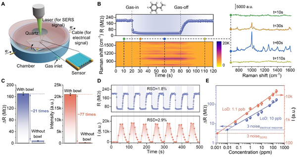图3. 以VOCs为代表性目标气体,进行电学实时监测和SERS谱学精准识别双模敏感性能验证。