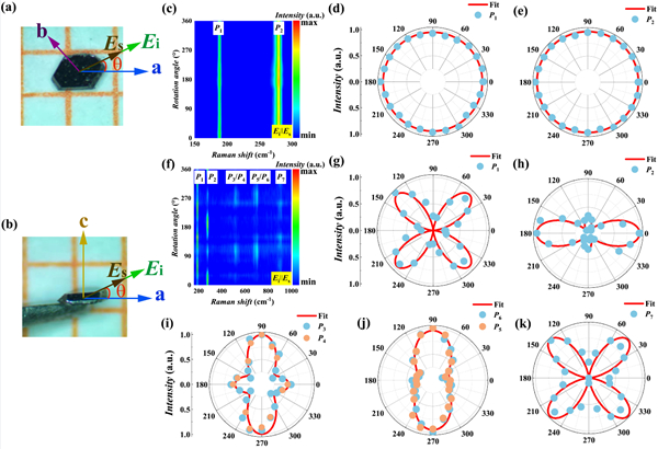 图2. 转角偏振Raman光谱测量给出七个模式的角度依赖,并与理论进行对比。