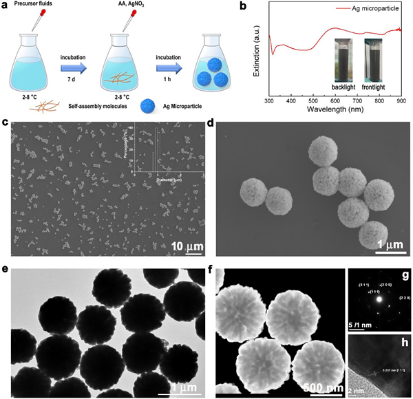 图1. 银微米超粒子的制备流程以及基础表征图:a) 银微米超粒子制备流程图;b) 银微米超粒子的消光谱;c) 银微米超粒子的低放大倍率扫描电镜照片;d) 银微米超粒子的高放大倍率扫描电镜照片;e) 银微米超粒子的透射电镜照片;f) 银微米超粒子的扫描透射电镜照片;g) 银微米超粒子的选区衍射图案;h) 银微米超粒子表面高分辨透射电镜照片。