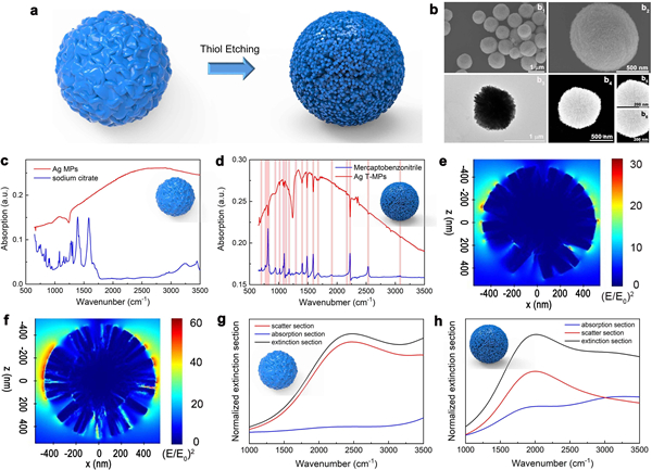 图2. 不同形貌的银微米超粒子的红外光谱以及理论模拟:a) 银微米超粒子的形貌优化策略;b) 优化后的银微米超粒子的基础表征照片;c) 银微米超粒子的共振表面增强红外吸收光谱;d) 优化后的银微米超粒子的共振表面增强红外吸收光谱;e) 银微米超粒子的电磁场理论模拟;f) 优化后的银微米超粒子的电磁场理论模拟;g) 银微米超粒子的消光截面的理论模拟;h) 优化后的银微米超粒子的消光截面的理论模拟。