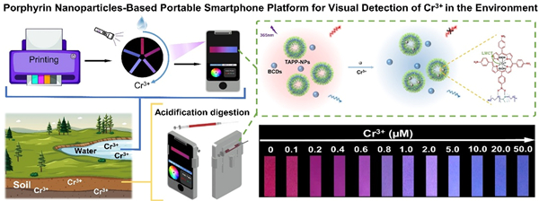 图. 基于卟啉纳米粒子的便携式智能传感设备可视化检测环境中Cr3+的示意图。