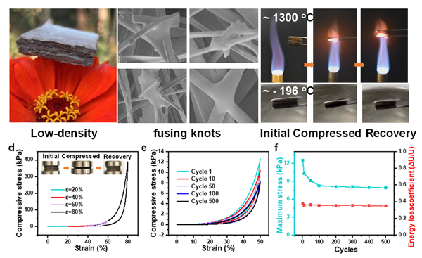 图1. 一维SiO2基气凝胶及耐温与机械性能。
