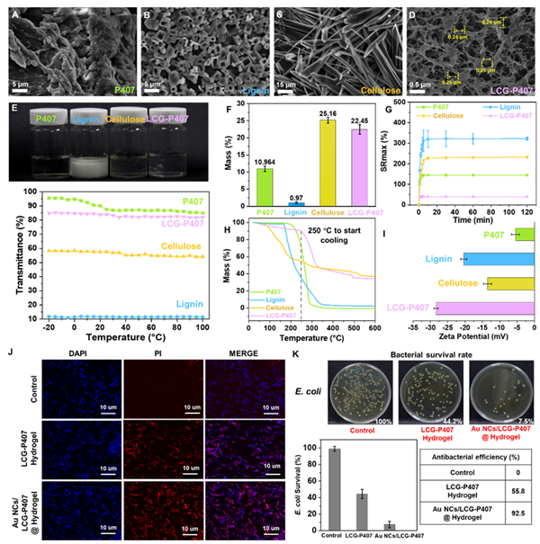 图2. 四种不同水凝胶的SEM数据:(A) Poloxamer 407 ,(B)木质素,(C)纤维素,(D) LCG-P407;(E) 不同水凝胶的透明度;(F) 不同水凝胶的失水率测试;(G) 不同水凝胶的溶胀动力学实验测试;(H) 不同水凝胶的热重数据表征;(I) 不同水凝胶的zeta数据表征;(J) 激光共聚焦显微镜照片:LCG-P407水凝胶和Au NCs/LCG-P407 @水凝胶对细菌的作用;(K) LCG-P407水凝胶和Au NCs/LCG-P407 @水凝胶大肠杆菌抗菌实验示意图。