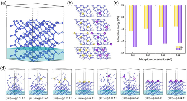 图1. cg-N表面吸附Na,K原子的性质对比:吸附模型(a)和(b),不同吸附浓度下的吸附能(c),300 K下不同吸附浓度时的分子动力学模拟(d)。