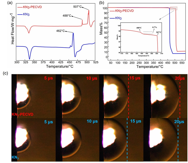 在此基础上,基于钾的电负性比钠更弱,提出了采用更安全和更便宜的叠氮化钾来替代叠氮化钠作为前驱体来合成cg-N的方法,如图1 所示,第一性原理计算结果表明钾吸附在增强cg-N表面稳定性上要远优于钠吸附。基于自主研建的等离子增强CVD装置,不借助纳米限域效应,成功在常压下合成了cg-N,样品可以保存2个月以上(图2)。如图3所示,同步热分析(TG-DSC)测量结果表明cg-N具有488 ℃的热分解温度,与理论预测的477 ℃分解温度相符合,尖锐的分解放热峰表明其具有典型的高能量密度材料热分解行为;激光等离子驱动微爆法测试表明样品的爆速有显著提升。由于不需要高压或碳纳米管束缚且前驱体更安全和便宜,因而该合成方法具备宏量制备和工程应用的技术优势。