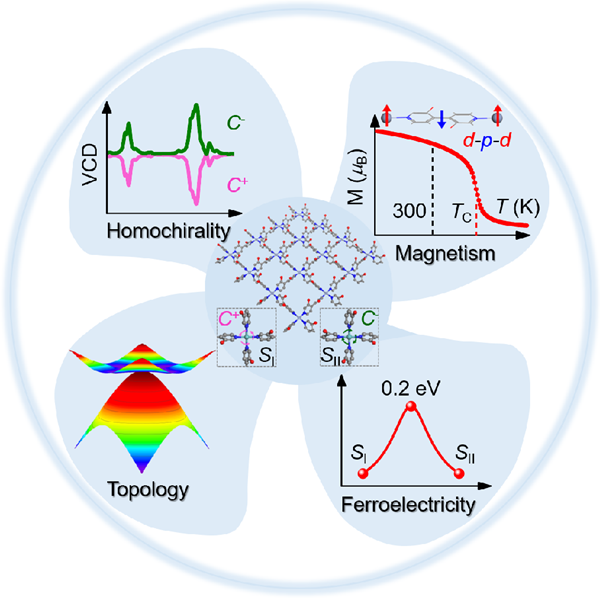 图. 具有手性、室温磁性、铁电性和拓扑特性的二维金属有机框架材料示意图。