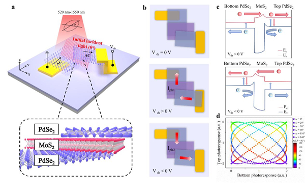 近期,中国科学院合肥物质院固体所纳米材料与器件技术研究部李亮研究员与华中科技大学翟天佑教授合作,在二维材料偏振光学信息处理领域取得了重要进展。研究团队成功构建了基于PdSe2/MoS2/PdSe2范德瓦尔斯异质结(vdWH)的偏振敏感型光电探测器,首次实现了单一器件在宽谱域偏压可切换模式下对线偏振角(AoLP)与线偏振度(DoLP)的同步检测,相关研究成果以“Simultaneous AoLP and DoLP Detection in a Bias-Switchable PdSe2/MoS2/PdSe2 Heterojunction for Polarization Discrimination”为题发表在Advanced Materials(Adv. Mater. 2025, 2500572)上。