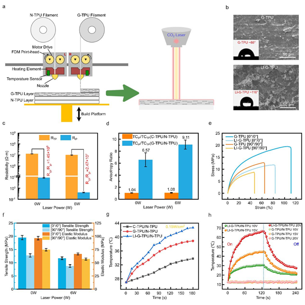 为了进一步提升复合材料各向异性导热性能,团队采用激光诱导处理了3D打印的石墨烯增强热塑性聚氨酯(G-TPU/N-TPU)双层结构。研究发现,激光处理保留了复合物中的石墨烯片的取向和双层结构的完整性,同时暴露与重构了石墨烯网络,形成了TPU碳化层并调控其缺陷态,显著提升了各向异性导电性(RTP/RIP 从1.45×106 增至2.47×107)和各向异性导热比(TCIP/TCTP 增至9.1)。激光处理分解聚合物基体后,在复合材料表面形成的微尺度结构与粗糙表面提高了材料表面疏水性(接触角从88° 增至约120°),使入射光发生多次反射以延长光程,显著增强了光热转换效率。