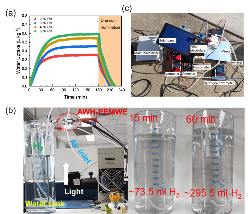 基于此,研究人员提出了一种光热空气集水-质子交换膜电解自驱动系统(图1)。该系统以有序多级孔碳为空气集水吸附剂,与改装的电解槽耦合,实现空气集水-光热蒸发-光驱动电解过程。吸附剂的多级孔结构(微孔-介孔-大孔)通过模板法与高温煅烧构建,再通过表面氧化增强亲水性。在40%相对湿度下实现 0.49升/千克吸附剂/小时的吸水量,同时在20%相对湿度的干旱条件下依然保持稳定吸湿与光热蒸发性能(图2a)。在室内40%相对湿度模拟条件下,该系统在1.65V恒电压工作时,绿氢生产速率可达295.5毫升/小时,系统循环性能优异,能够长期稳定运行(图2b)。野外环境测试结果显示 (图2c),该系统无需外部加热或额外能量输入,真正实现了全太阳能驱动、零碳排放的绿色制氢。